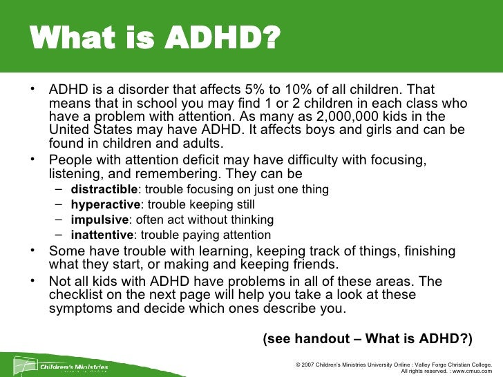Symptoms of adhd include inattention (not being able to keep focus), hyperactivity (excess movement that is not fitting the difference in children with adhd is that their hyperactivity and inattention are noticeably greater than expected for their age and cause distress. Adhd what is the latest research on children with adhd? Are kids with adhd covered under idea? warmline family resource center: American occupational therapy association, inc. 5.1 defining disability and some statistics.
